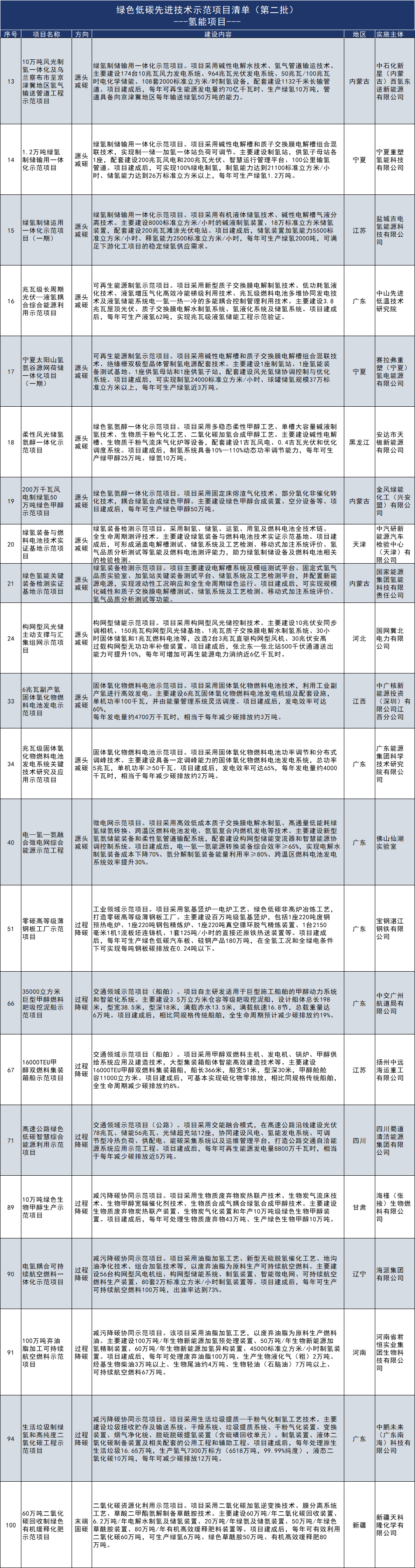 22个氢能项目如下表:
