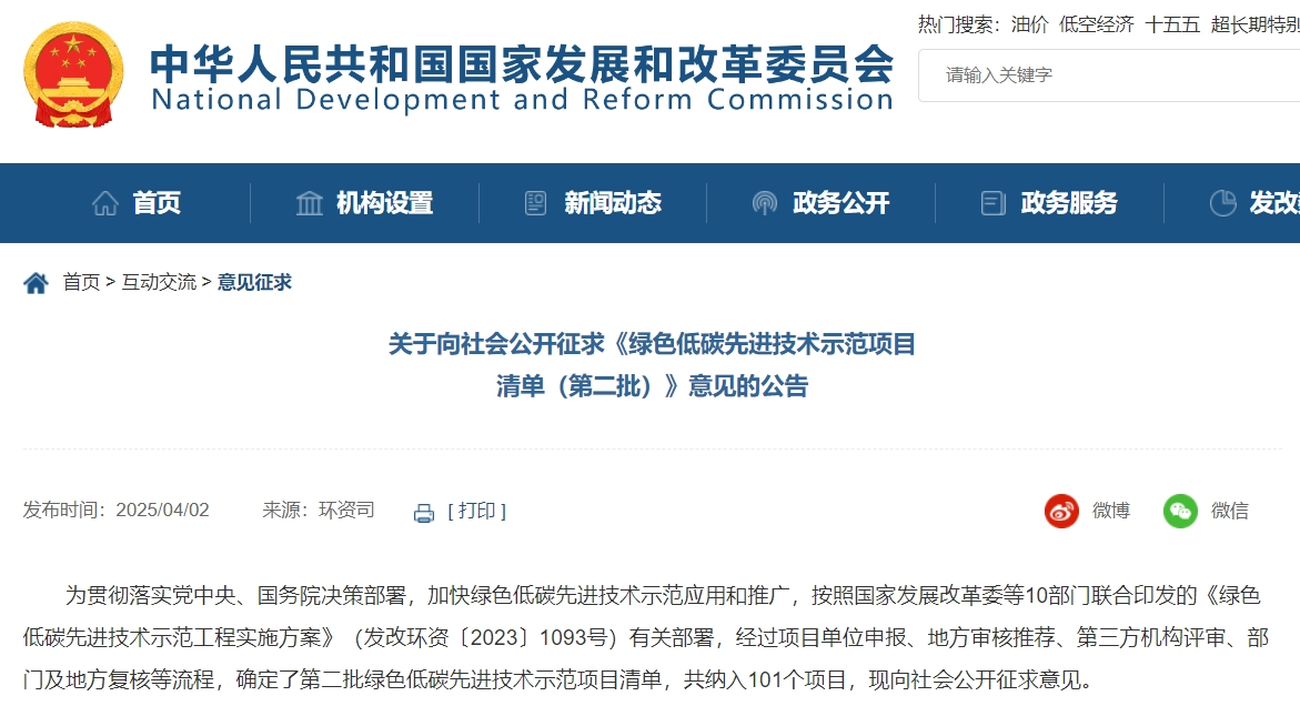 4月2日,国家发展改革委发布关于向社会公开征求《绿色低碳先进技术示范项目清单(第二批)》意见的公告,确定了第二批绿色低碳先进技术示范项目清单,共纳入101个项目。
