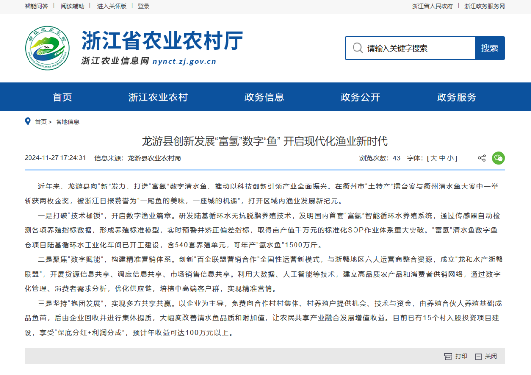 2024年11月27日,浙江省农业农村厅发布了文件“龙游县创新发展‘富氢’数字‘鱼’ 开启现代化渔业新时代”。氢水鱼在衢州市“土特产”擂台赛与衢州清水鱼大赛中一举斩获两枚金奖,被浙江日报赞誉为“一尾鱼的美味,一座城的机遇”,打开区域内渔业发展新纪元。 从文件数据可以看出,“富氢”数字清水鱼打破“技术枷锁”,不仅提升了鱼肉品质满足了人们对健康的需求,还提高了鱼的销售额,带动了地区经济发展。 除了浙江省龙游县,南海丹灶、广东清远、浙江江山等地也有富氢鱼养殖基地。 试水”氢农业 养出富氢鱼 在南海,氢能元素不仅存在于工厂、交通设施汇总,还存在鱼农田里、鱼塘中,一扇更大的“氢生活”大门正徐徐打开。 走进丹灶伏水村氢水养殖示范基地,可见四个直径4米,深3米的养殖池,里面游过一条条富氢水滋养的鱼。 据了解,该基地充分探索并融合氢水应用在种养殖中的技术,以达到试点示范、景观展示、科普课堂等综合效应,促进水产行业转型升级,形成新的经济增长点,助力乡村振兴。 广东氢水鱼农业科技有限公司工作人员苏锦全说道“基地依靠纳米切割制氢水机产出小分子水,它像胶囊似的包裹逃逸的氢气,让其不易排除水体,溶存期更长(最长可达7小时。)” 他还表示“吸收富氢水的鱼营养价值更高,虽然比市场买到的鱼要贵一点,但是吃起来会更鲜甜。”富氢水养殖可有效改善养殖水质,增加微生物群落丰富度,降低鱼的应激性,提高生长性能,改善形体指标。 【原文:南海丹灶】 融入“氢能”,渔获丰收! 鳜鱼,俗称桂花鱼,“一条鱼”游出“一条链”,目前清新区“苗种繁育-养殖-加工-流通-品牌建设”全产业链发展格局已初见雏形。“润阳渔光互补项目”从2023年11月投入5万余尾“饲料鳜鱼”入塘,到如今破水而出,总产量预估超40000余斤。项目采取“渔光互补”的创新模式,将太阳能电池板架设在水面上阻挡太阳辐射,可使水体温度降低,有利于水产养殖、提升太阳能电池板的发电效率,减少了农业、工业和住宅用地等土地资源的占用,切实提高土地经济价值,此举为清远养殖业打造“碳中和”试点,探索绿色发展道路填补了空白。 在“双碳”和能源安全目标引领下,能源领域技术、模式、业态的创新正在推动诸多新趋势的涌现。太阳能和氢能更是其中的清洁能源,两者更是可以互相融合,太阳能发电氢气储能,可以做到余电制氢储能。 该合作为光伏板下饲料鳜鱼养殖试验,同时开展探索余电制氢,氢储能发电,余氢调水养鱼。据悉,本项目的合作以“光伏+”产业联动模式为支撑,融入“氢能”“渔业”实现高标准高效0排放鱼塘效果,助力清新区打造“美丽鱼塘”,“碳”寻绿色经济,推进实现节能减排的绿美生态建设持续走深走实。 【原文:广州日报新华城】 什么?你说长河广场地下室在养鱼? 长河渔场外塘水域面积8亩,长河渔业公司于2011年从秀峰村承包流转土地,采用传统的养鱼模式发展养鱼。随着人们生活水平不断提高,对食物的追求逐渐从“吃得饱”向“吃得好”改变,面对技术与市场的“双重挑战”,长河渔业公司整合资源、挖掘潜力,开始朝着科学养鱼的方向转型。 近年来,公司先后投资近60万元引入一系列智能化养鱼设备,并在去年与中国水产研究员东海水产研究所陈起群博士开展合作,采用富氢养殖技术,开启生态养鱼新模式。长河渔业公司总经理毛毅强表示,“程博士主要指导我们开展鱼病防治,在他的帮助下,探索建立富氢水生态循环系统数据化养鱼,成效明显。 目前长河渔场富氢化养殖技术已实现标准化、规模化、可复制化,产量得到大幅提升。 【原文:江山新闻网】