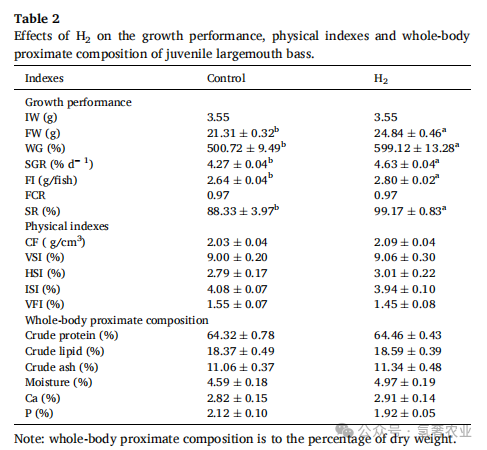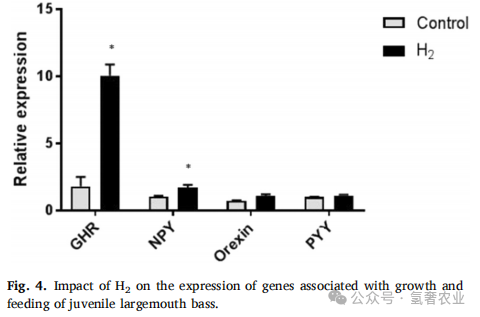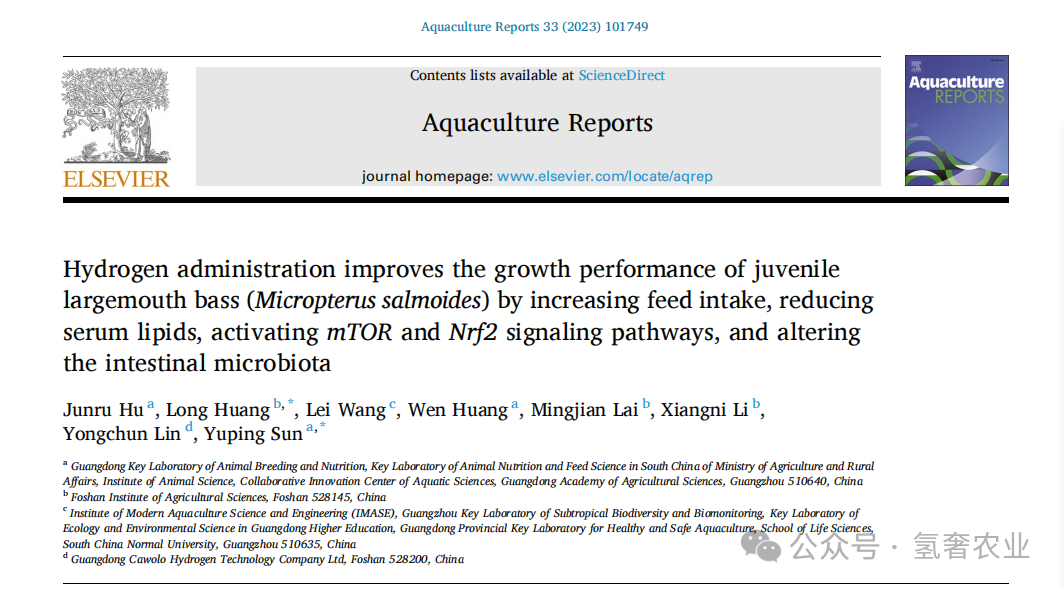 广东省农业科学院动物科学研究所(水产研究所)胡俊茹副研究员团队的研究表明,氢水养殖可加快大口黑鲈苗种生长速度约为12-16%,提高培苗的成活率7-10%,其机理与氢气调控促摄食因子NPY、生长因子GHR的高表达,以及上调PI3K/AKT/mTOR和Nrf-2/Keap1信号通路有关,同时也改善了大口黑鲈苗种肠道有益菌丰度。总之,氢水养殖在渔业低碳转型生产中展现了广阔的应用前景。