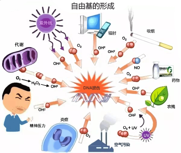 ✅ 每天攻击 7.3 万次:每个细胞每天被自由基攻击约 7.3 万次,其中 5% 会导致 DNA 链断裂或基因突变。