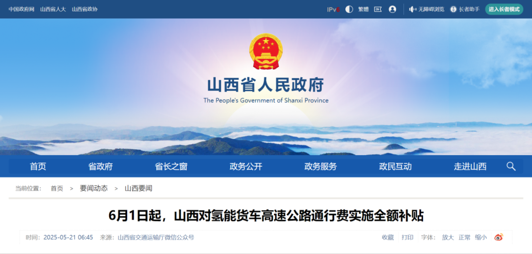 5月20日,山西省发展和改革委员会、省财政厅、省交通运输厅、省行政审批服务管理局联合下发《山西省发展和改革委员会等部门关于对通行山西省高速公路的氢能货车实施通行费补贴的通知(试行)》(以下简称《通知》),决定自2025年6月1日0时至2027年5月31日24时,对氢能货车高速公路通行费实施全额补贴。