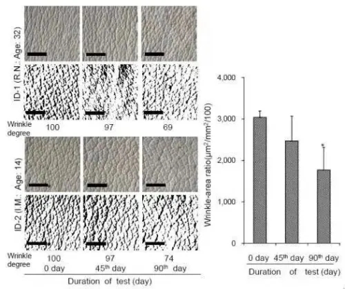 皮肤放大,皱纹深度比较。氢浴90天后皱纹深度显著减小。