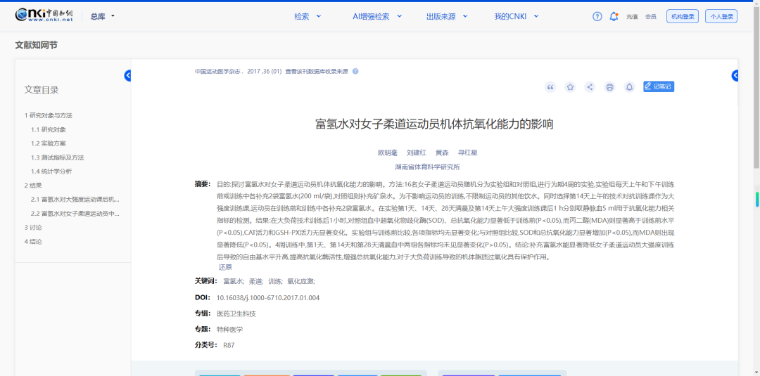 论文标题:《富氢水对女子柔道运动员机体抗氧化能力的影响》