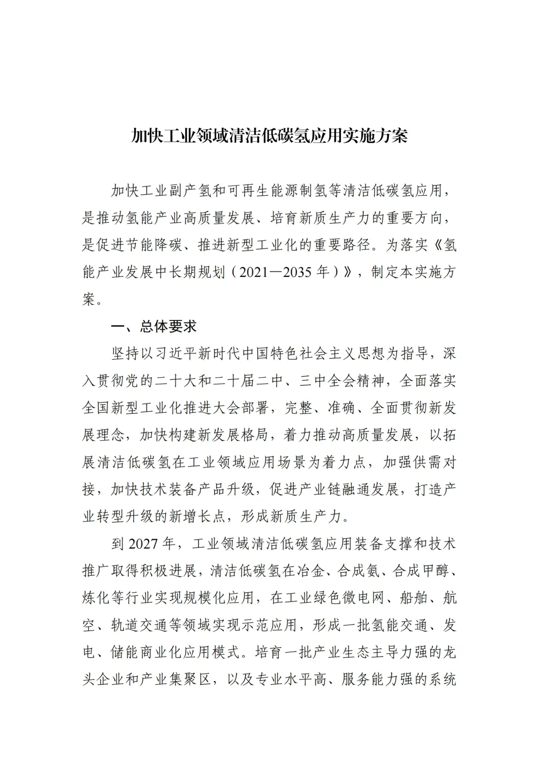 到2027年,工业领域清洁低碳氢应用装备支撑和技术推广取得积极进展,清洁低碳氢在冶金、合成氨、合成甲醇、炼化等行业实现规模化应用,在工业绿色微电网、船舶、航空、轨道交通等领域实现示范应用,形成一批氢能交通、发电、储能商业化应用模式。培育一批产业生态主导力强的龙头企业和产业集聚区,以及专业水平高、服务能力强的系统解决方案供应商,初步构建较为完整的产业链和产业体系。