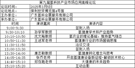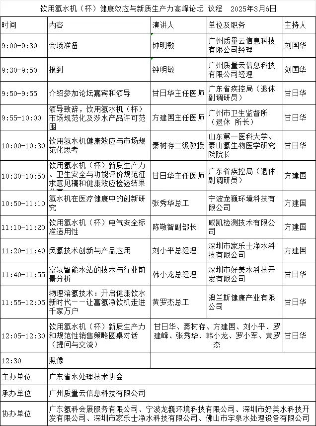 由广东省水处理技术协会和广东氢科会展服务有限公司共同主办的饮用氢水机(杯)健康效应与新质生产力高峰论坛,将于2025年3月6日在广州保利世贸博览馆4号馆隆重举行。 具体议程安排如下: 本次论坛将围绕饮用氢水机(杯)市场规范化及涉水产品许可范围、饮用氢水机健康效应与市场规范化思考、饮用氢水机(杯)新质生产力、卫生安全与功能评价规范征求意见稿和健康效应检验结果分享、氢水机在医疗健康中的创新研究、饮用氢水机(杯)电气安全标准适用性、负氢技术创新与产品应用、富氢智能水站的技术与行业前景分析、物理溶氢技术:开启健康饮水新时代——让富氢净饮机走进千家万户等议题与参会人员交流讨论。