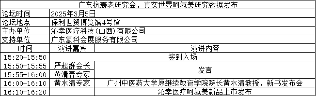 由沁幸医疗科技(山西)有限公司主办的广东抗衰老研究会,真实世界呵氢美研究数据发布,将于2025年3月5日在广州保利世贸博览馆四号馆论坛区举办。