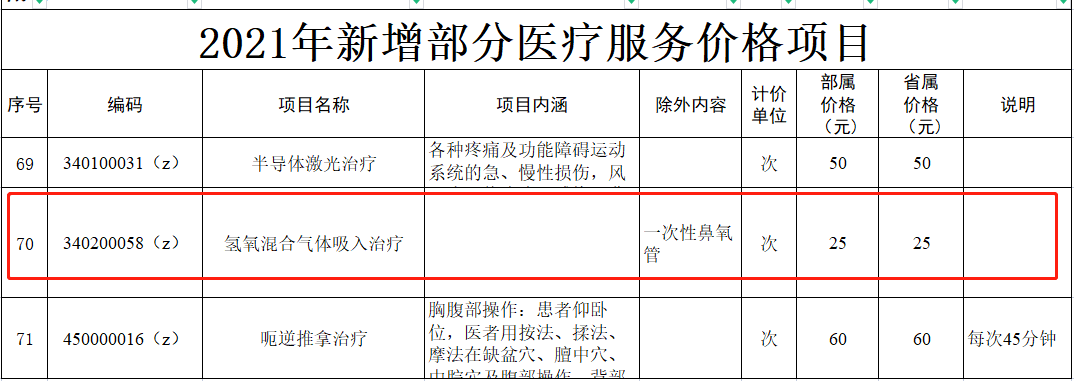 为促进医疗新技术的推广应用,满足人民群众日益增长的医疗服务需求,山东省医疗保障局根据《山东省新增医疗服务价格项目管理办法》规定,经组织专家评审论证,新增部分医疗服务价格项目,修订现行部分医疗服务价格项目中,明确了氢氧混合吸入的收费标准,且在山东省医保范围内。